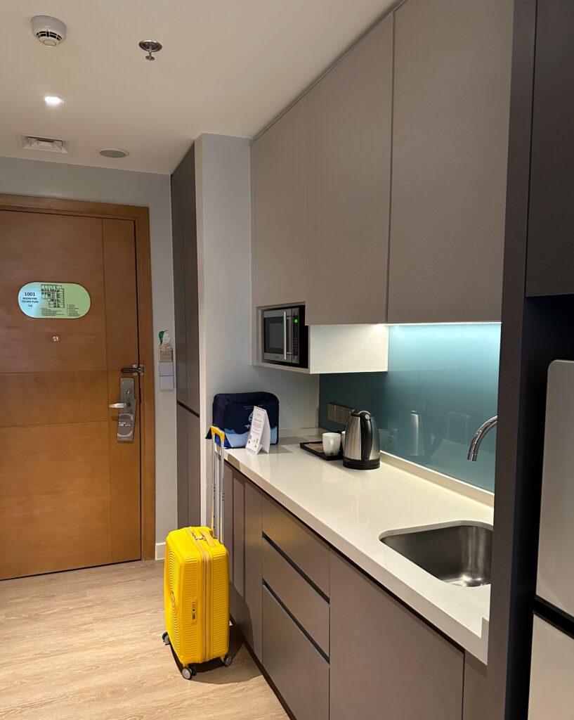 We stayed in a Studio Deluxe Room with Queen-Size Bed complete with a kitchenette, full refrigerator, and the usual hotel amenities.
